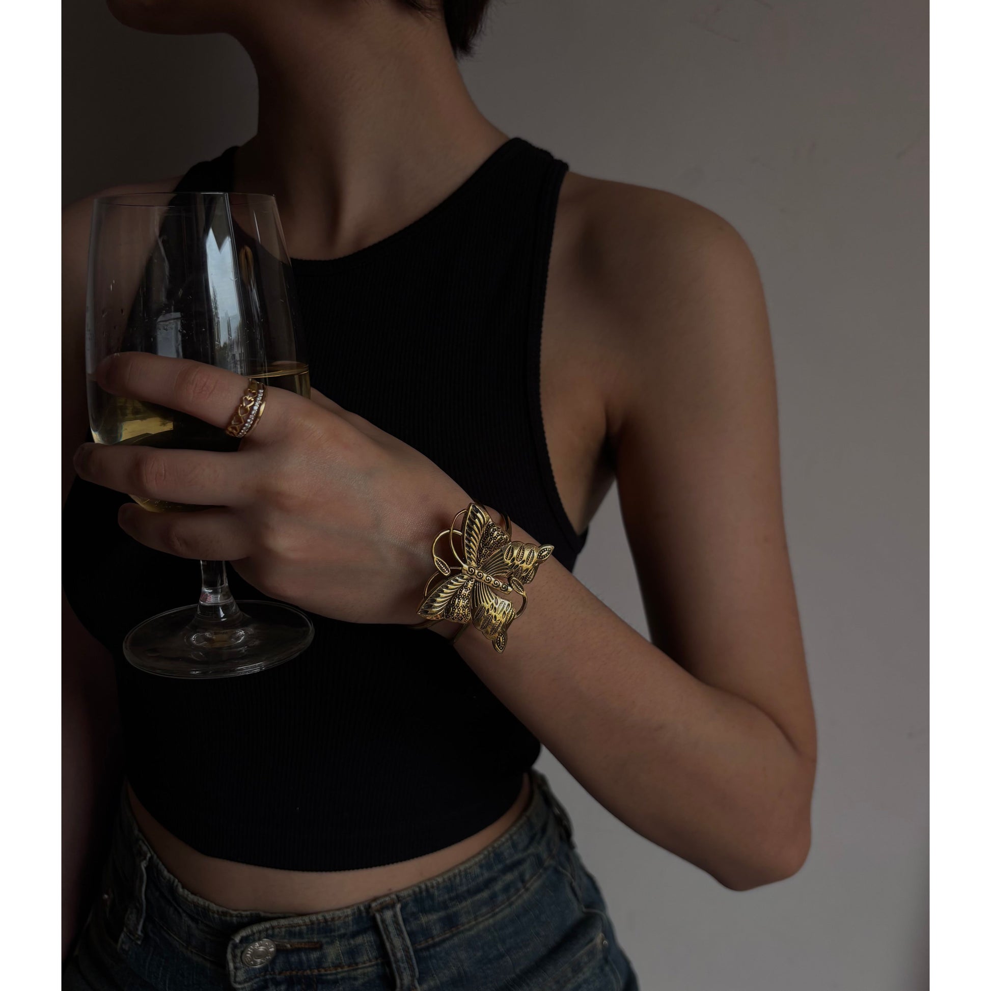Introducing FAIRY GOLDEN - a delicate and versatile piece of jewelry! This butterfly-shaped beauty is crafted from brass and coated in a mesmerizing golden hue. Its adjustable feature allows for a perfect fit. A must-have for any quirky and fun-loving fashionista!