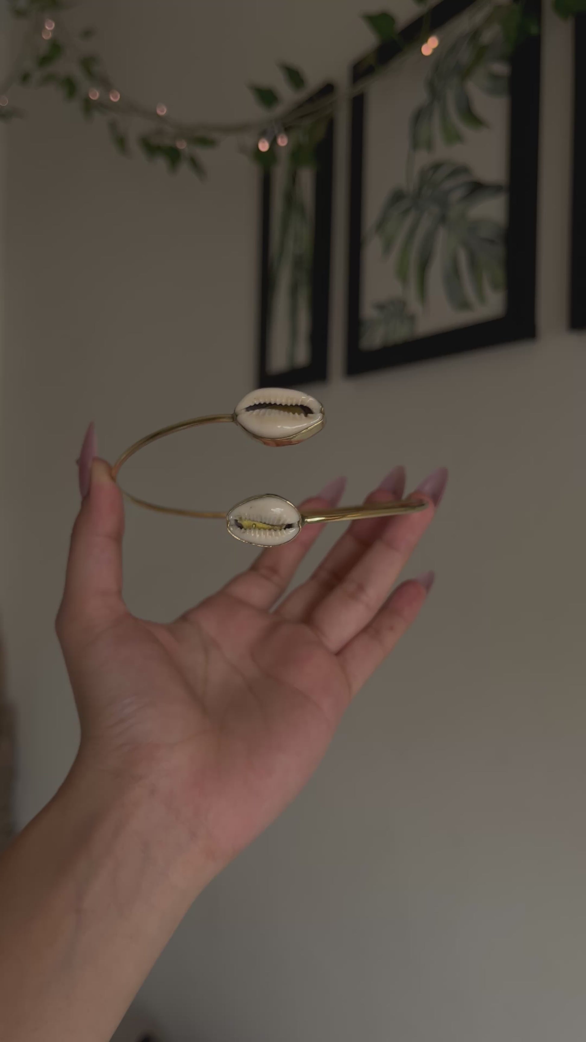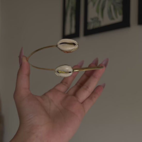 This elegant arm cuff features a cowrie shell design and is crafted from brass with a golden and silver plating. Its versatile style enhances any outfit, and its adjustable fit ensures comfort and adaptability.