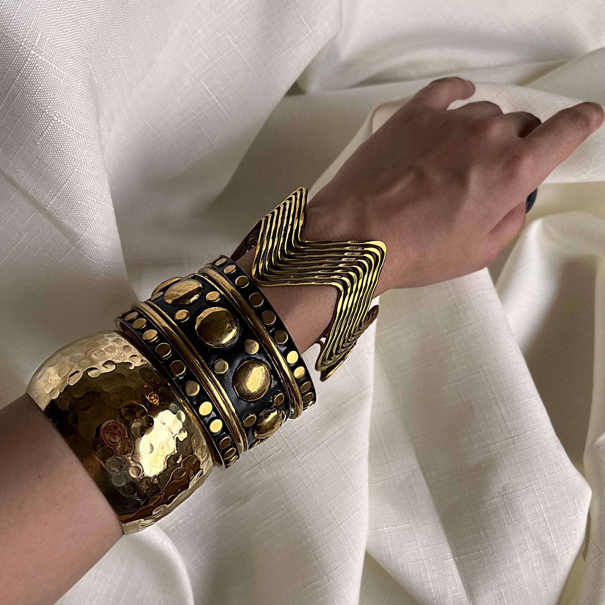 The Sunmetal set includes three distinct bangles crafted from brass and elegantly golden plated. Each piece showcases a unique design, offering versatile styling options that enhance any ensemble with a touch of refined sophistication. Perfect for stacking or wearing separately, these bangles bring timeless charm and individuality to your accessory collection.