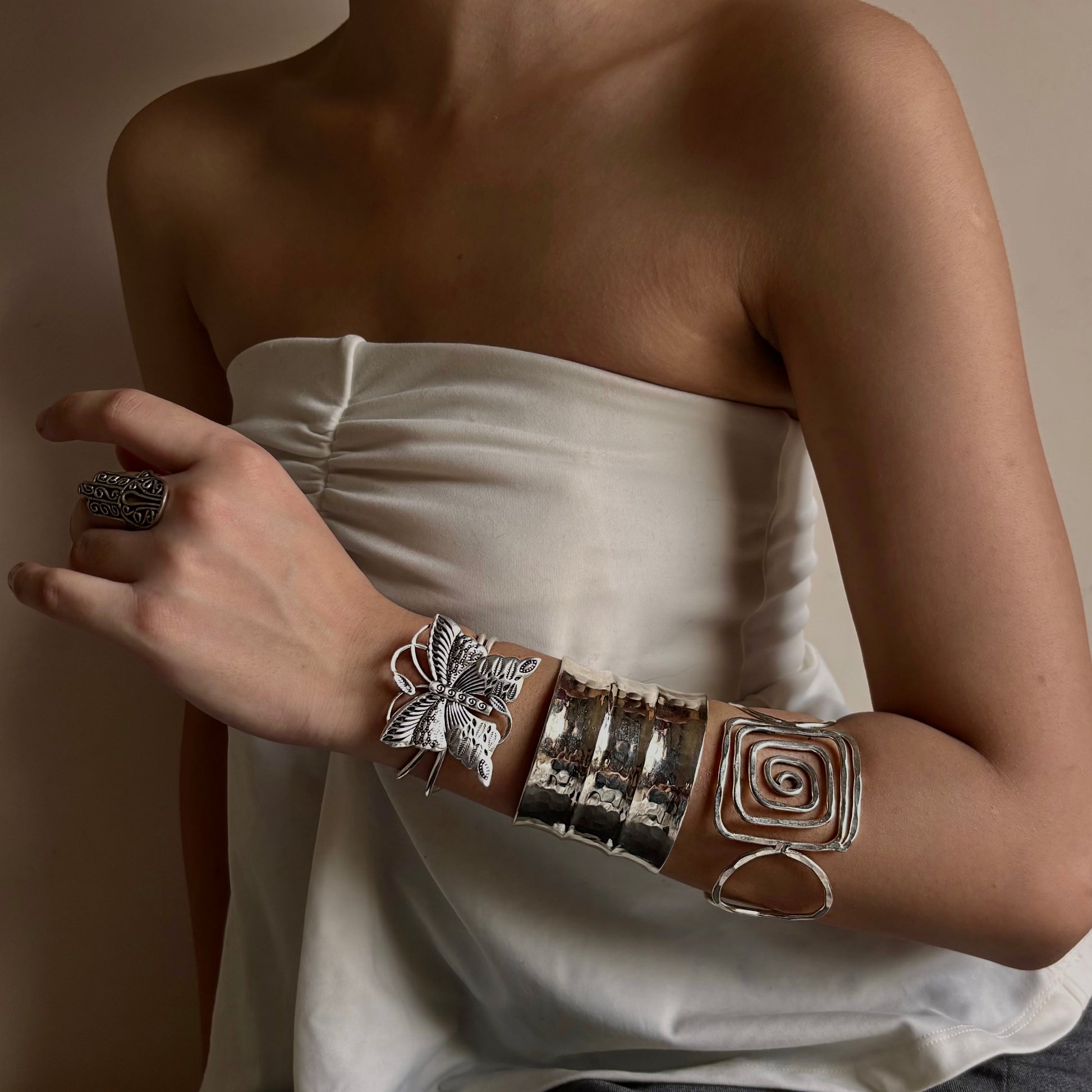 The Chroma stack of three bangles offers versatile elegance with its silver-plated brass design. Wear them together for a striking layered look or individually for a subtle, sophisticated accent. These bangles effortlessly enhance any ensemble, blending timeless style with modern versatility.