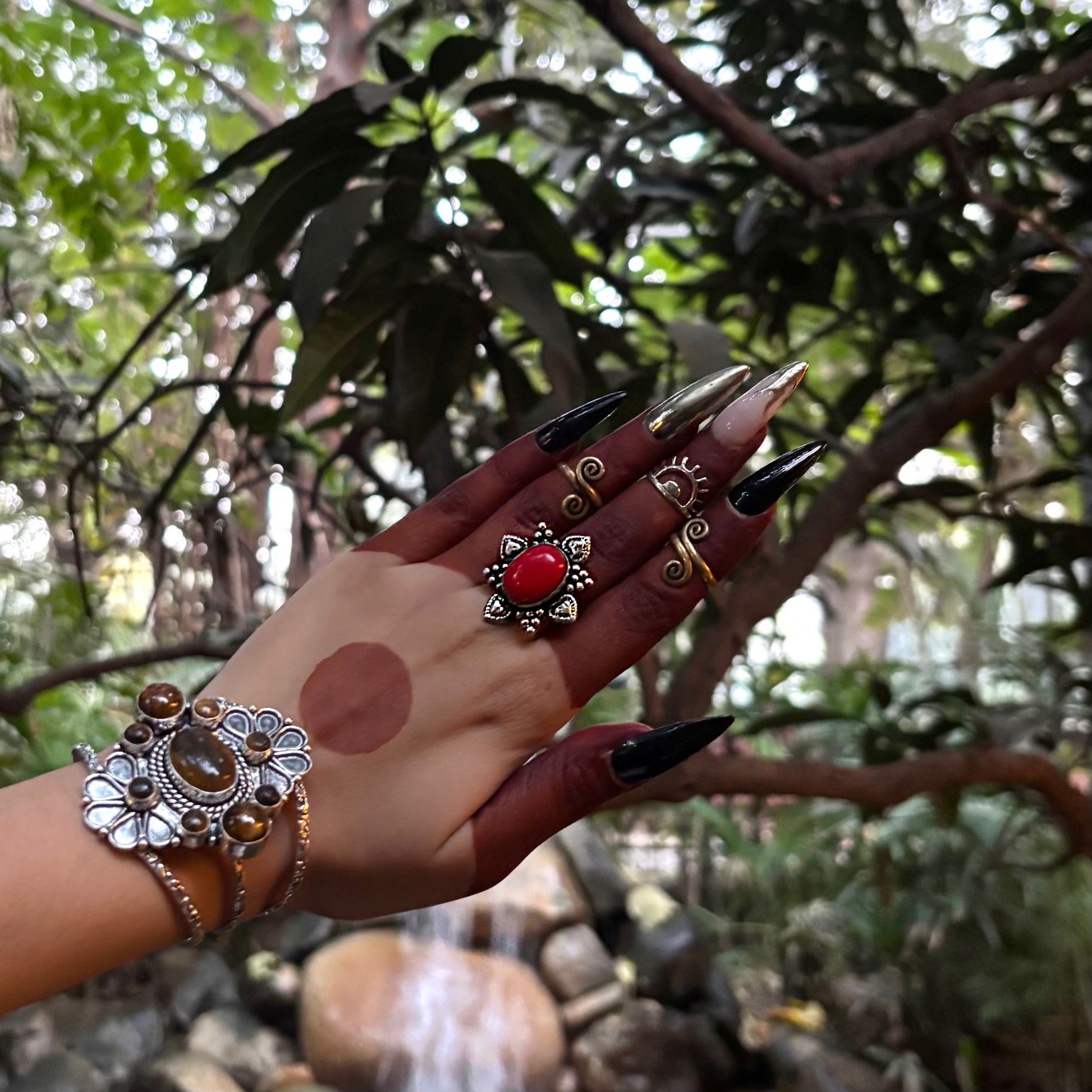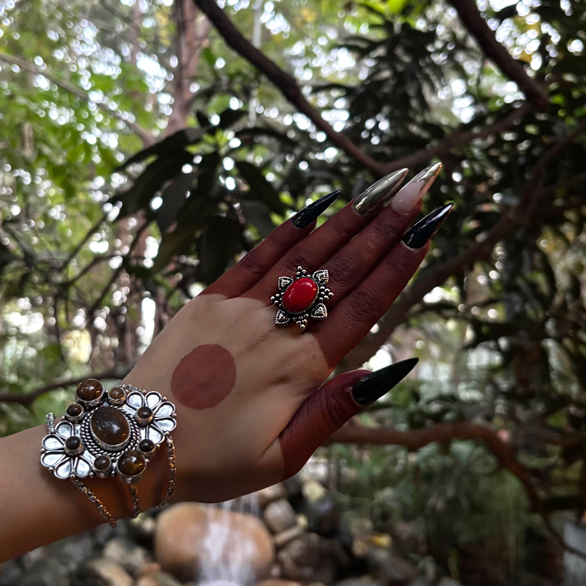 Crafted from high-quality brass with a sleek silver-plated finish, this piece features a striking Moonga (red coral) stone, prized for its rich hue and timeless appeal. Designed for effortless everyday elegance, its versatile, stackable silhouette makes it perfect for layering with other jewelry or wearing solo for a refined, modern look. A timeless essential that blends durability, understated luxury, and the natural beauty of coral.